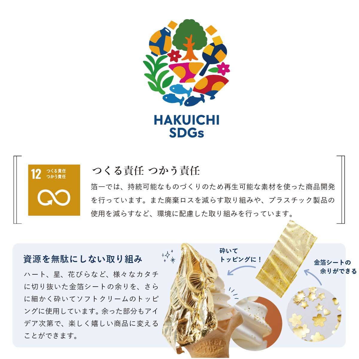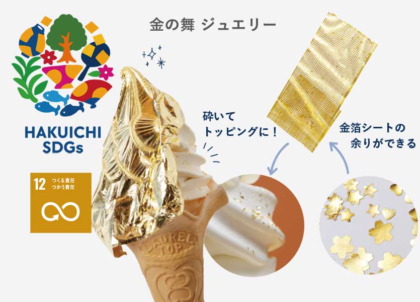 ハート、星、花びらなど様々なカタチに切り抜いた金箔シートの余りを、さらに細かく砕いてソフトクリームのトッピングに使用しています。 余った部分もアイデア次第で、楽しく嬉しい商品に変えることができます。