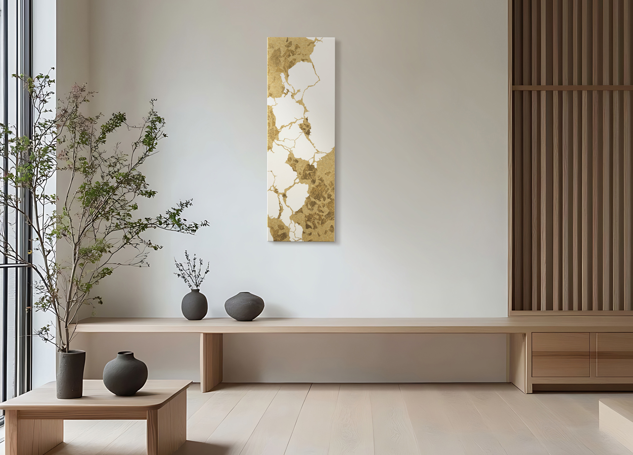 日本で生まれた、割れや欠けのある器を修復する伝統技法「金継ぎ」を、金沢箔で表現しました。金継ぎが象徴する「新たな生命力」が、壁面に独自の輝きを放ちます。