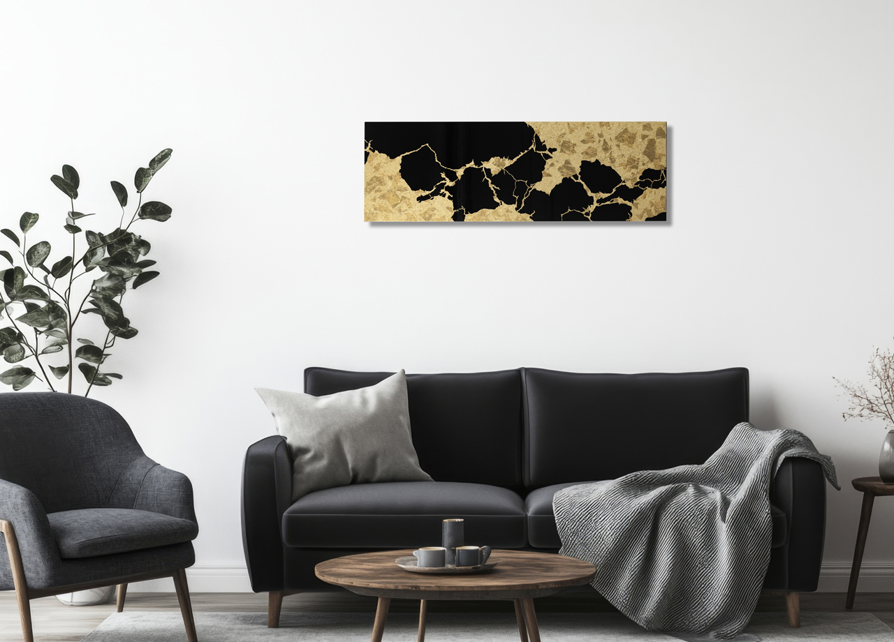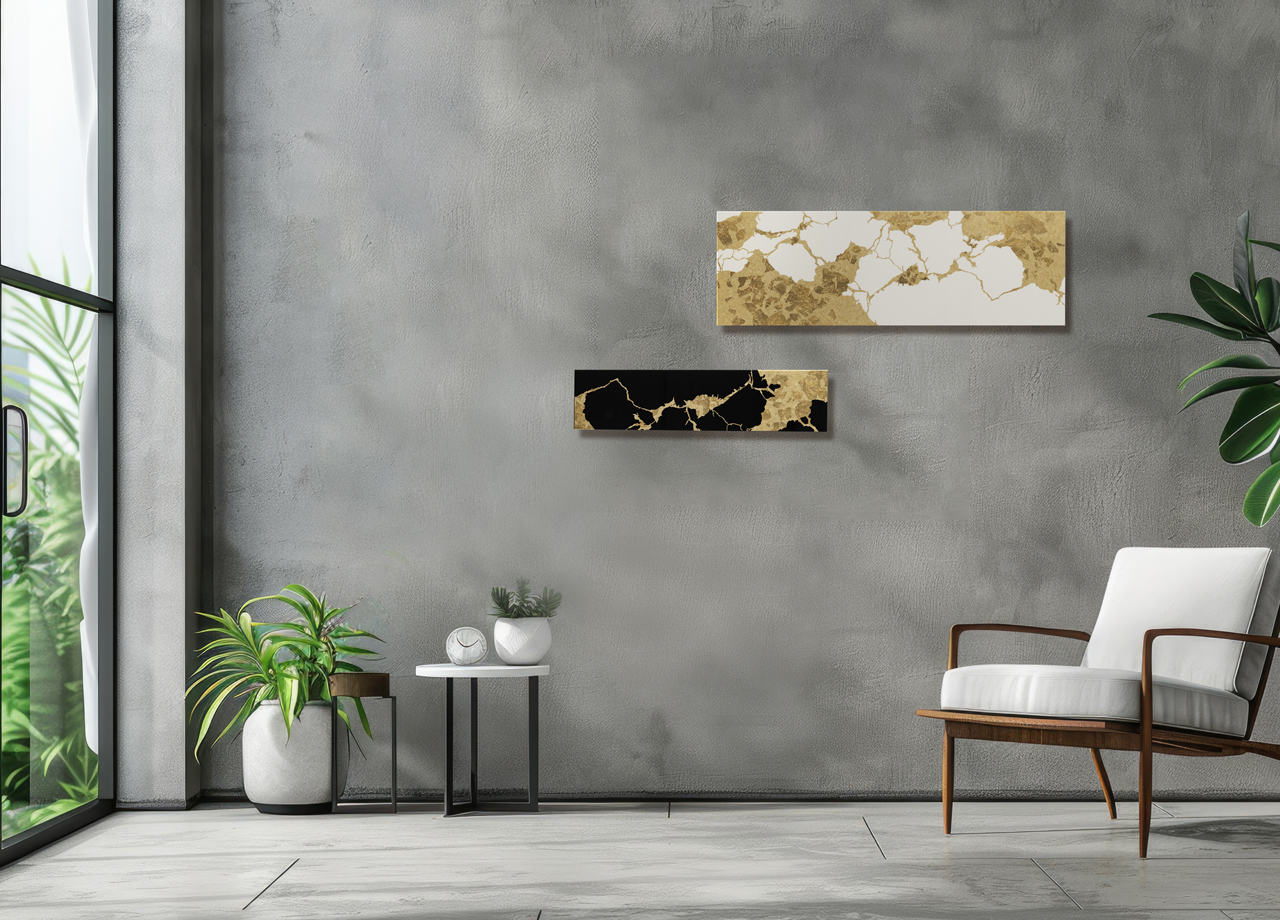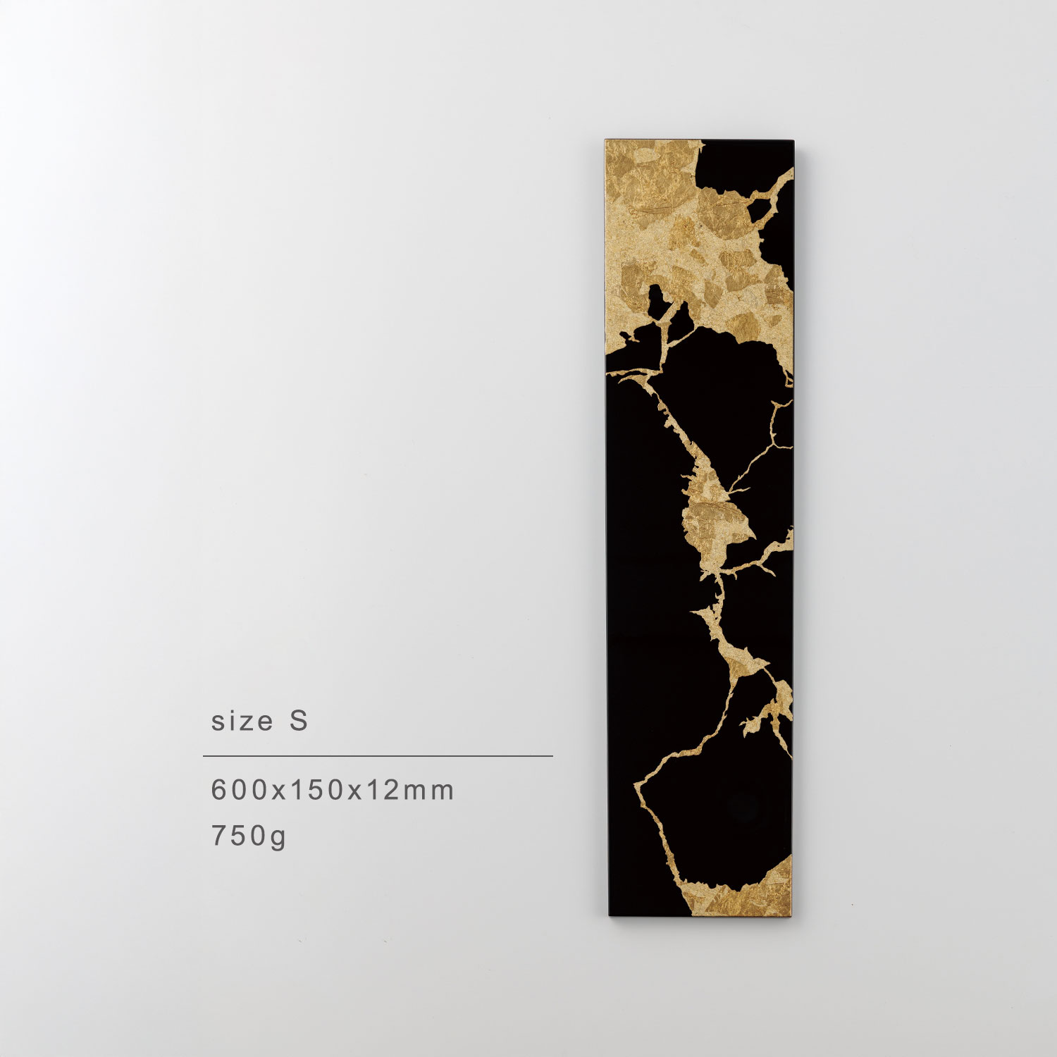 日本で生まれた、割れや欠けのある器を修復する伝統技法「金継ぎ」を、金沢箔で表現しました。金継ぎが象徴する「新たな生命力」が、壁面に独自の輝きを放ちます。