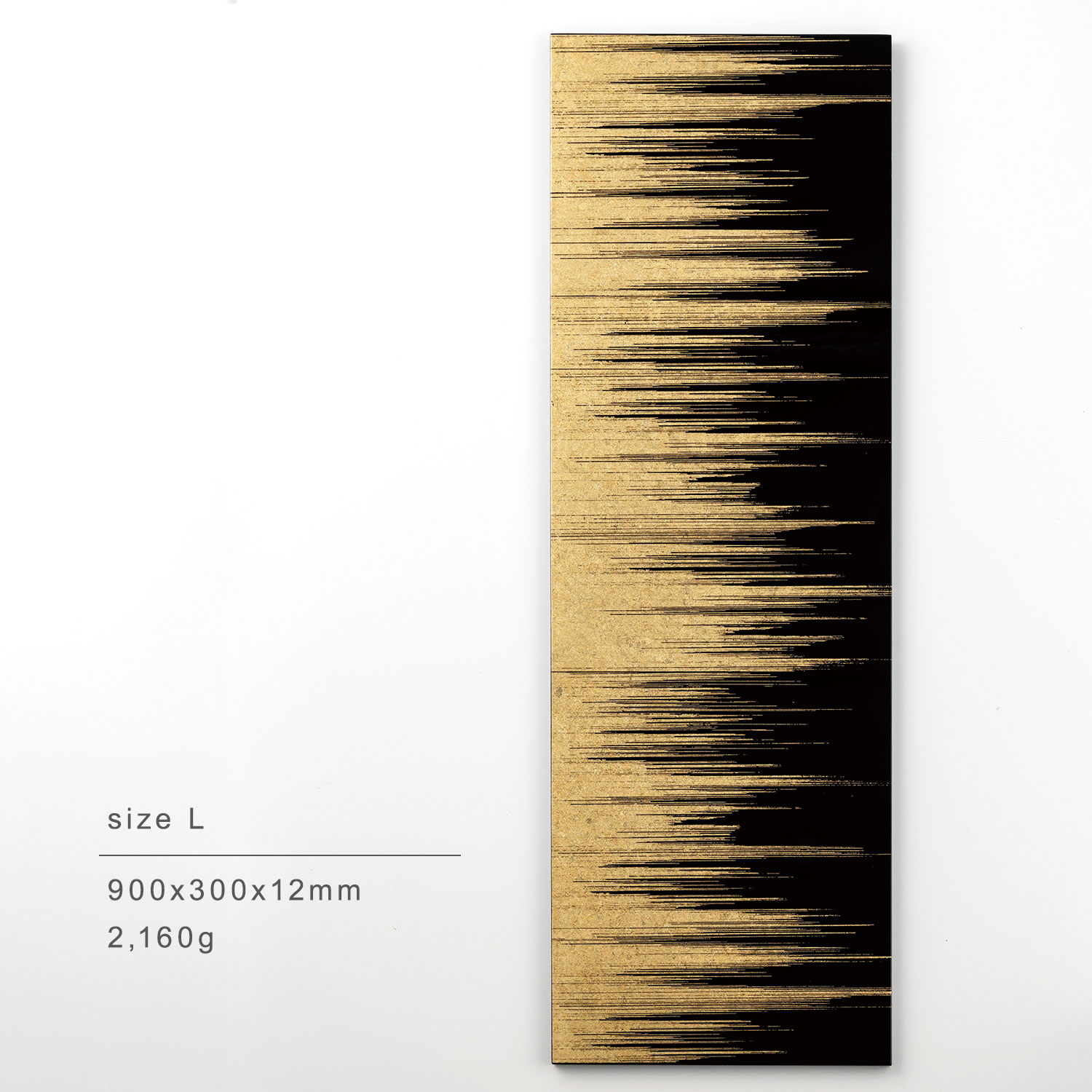 日本の左官職人が受け継ぐ伝統技法「櫛引」を、金沢箔で表現しました。規則的なラインは、風の流れや水の揺らぎのように表情を変え、壁面に豊かなリズムをもたらします。