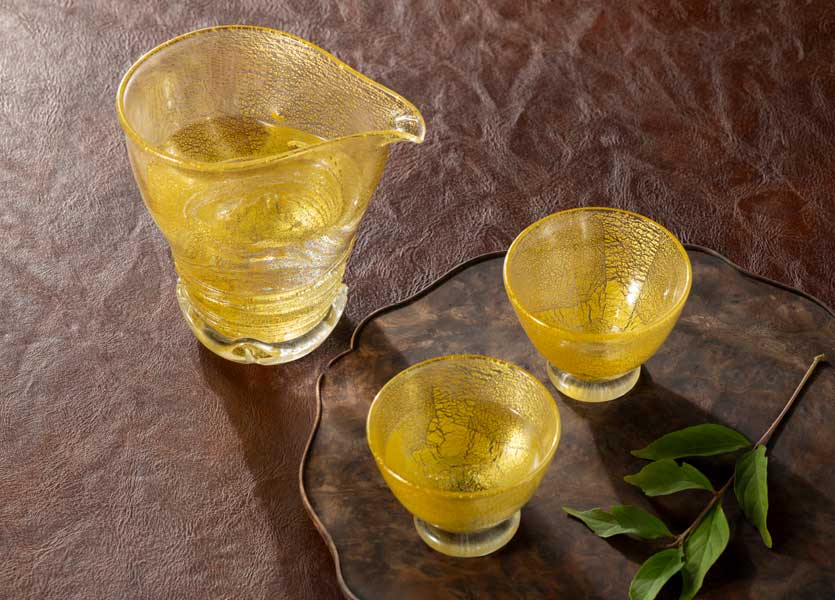 熟練の職人が一点ずつ丁寧に宙吹きで仕上げたガラス酒器に、金澄を贅沢に施した、華やぎと気品の酒器セットです。