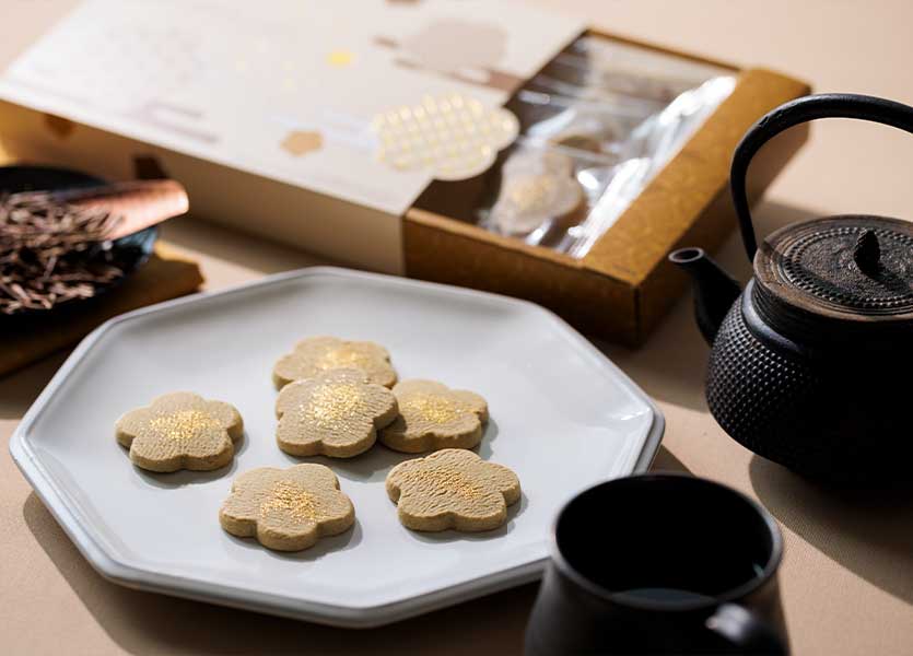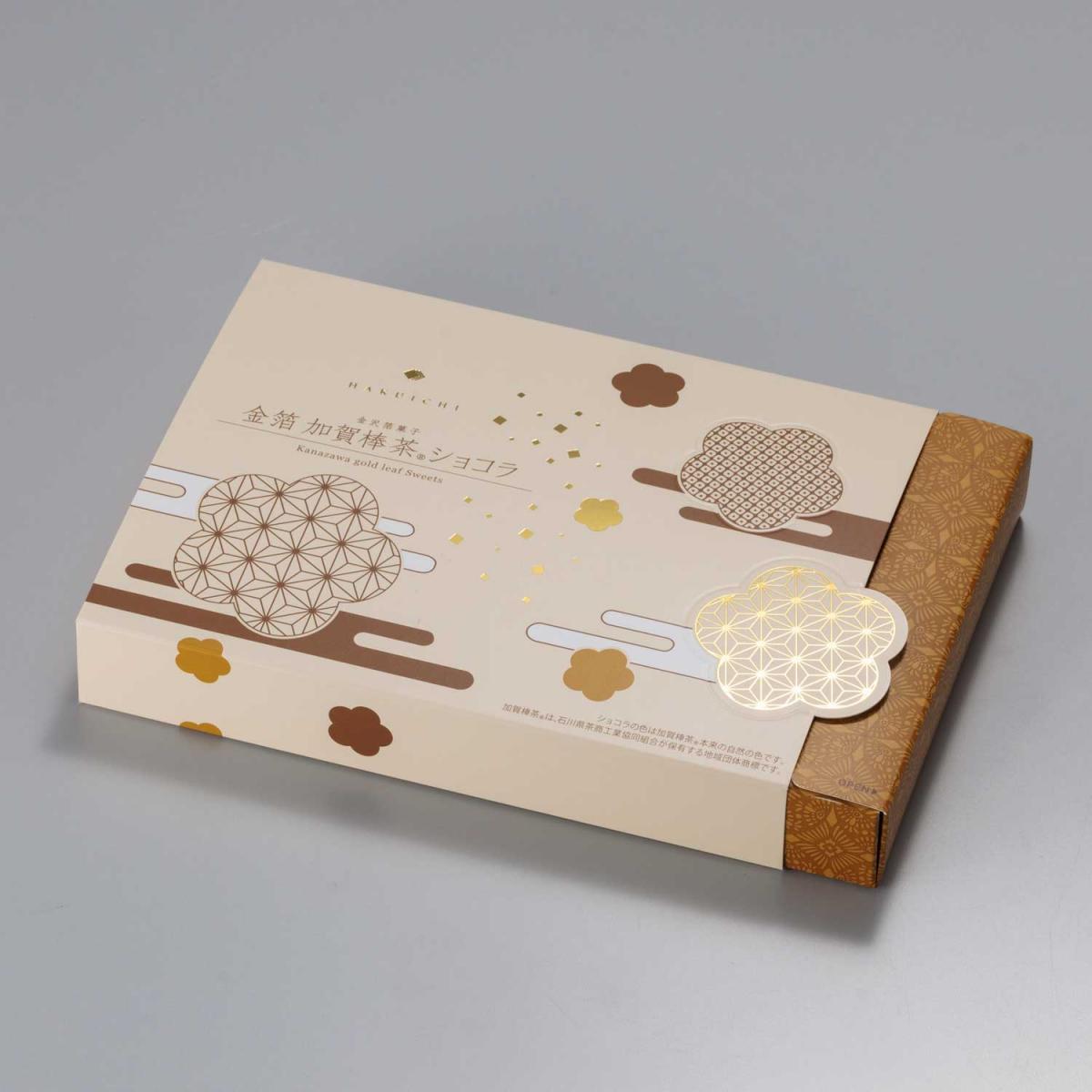 加賀棒茶の粉末を配合した香ばしい棒茶の香りのショコラに、金箔がきらっと輝きます。