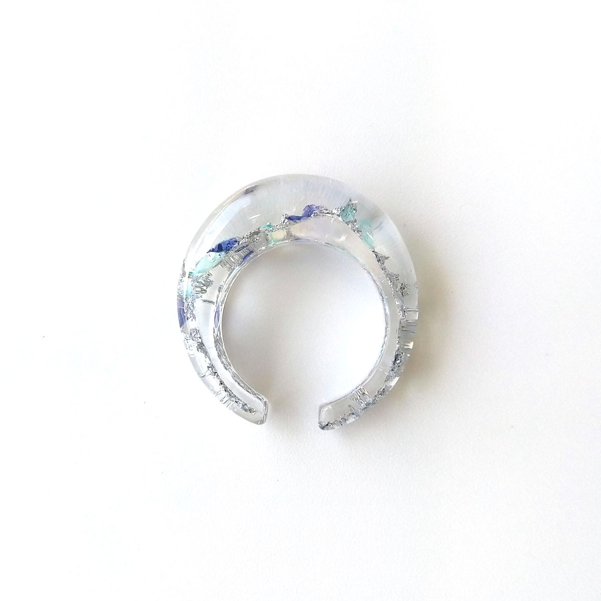 樹脂の中で輝くウロコは、廃棄される魚の皮を再利用したサステナブルなものを使用。