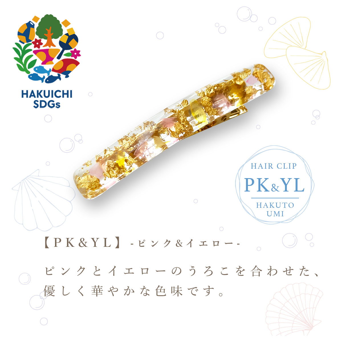 天然素材と箔と樹脂を用いたファッション雑貨シリーズ「ハクト」の、きらめく海をイメージしたUMIシリーズ。 髪をまとめたり、結んだ髪に飾りでつけたり、大活躍のヘアクリップが登場! つけるだけでいつでも、手軽に金箔ヘア気分を味わえます。