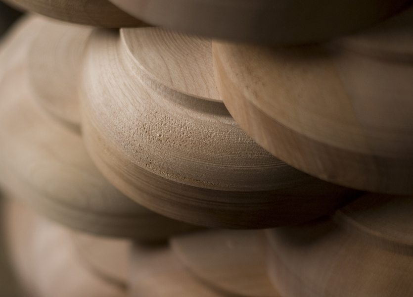 「おぼろ月」の器は天然素材にこだわりました。寒い土地で育ち目の詰まった木の塊を鮮やかな木目がでるように計算して削りだされていきます。