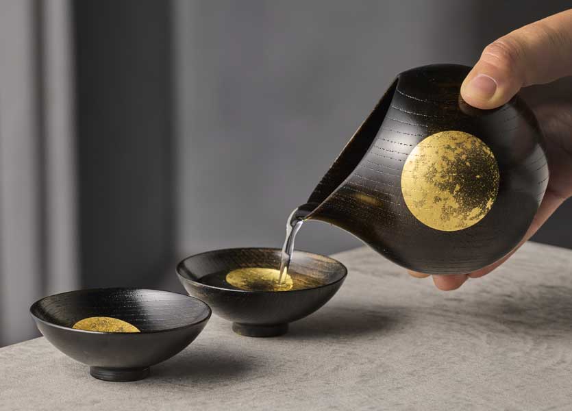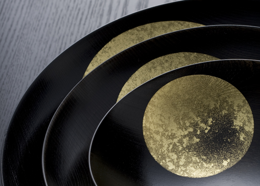 箔貼り職人が金箔だけでうっすらと影のある情緒的な月を表現した、美しいテーブルウェアシリーズ。
